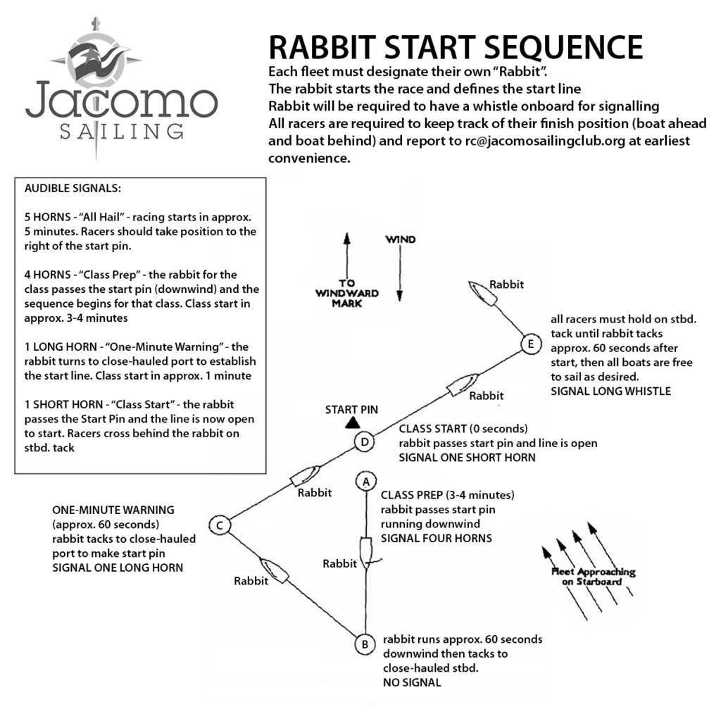 The Rabbit Start can be used to start a race to windward. At a prescribed time one of the boats passes an agreed upon mark and heads off on port tack creating a start line. Other boats must pass behind the “rabbit” on starboard tack in order to start. The diagram below, courtesy Jacomo Sailing Club, will help you to understand the sequence of a rabbit start.